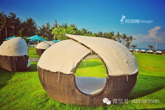 趁着快日落的当儿,走去花园和沙滩逛逛。这里整体水系设计可是华丽丽的,在庭院里四通八达,甚至可以借上皮划艇在园子水道里逛。在水系岸边点缀着各色绿植繁茂生长每一处都是景儿。海边摆放了如同外星人小屋一样的纳凉椅,回头傍晚就这儿呆着啦!