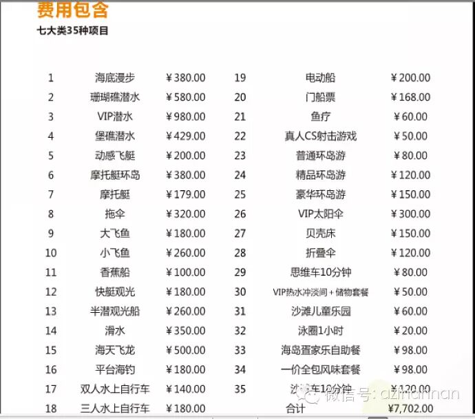 我若干年前在蜈支洲岛几次都还没有太多海上娱乐项目呢,这次来,才发现自己太out了,原来出了1399一价全包的活动。这个活动是怎样的呢?简直太超值了,有很长很长的一个无限次玩耍的表,我贴在了下面,可以尽情观赏。