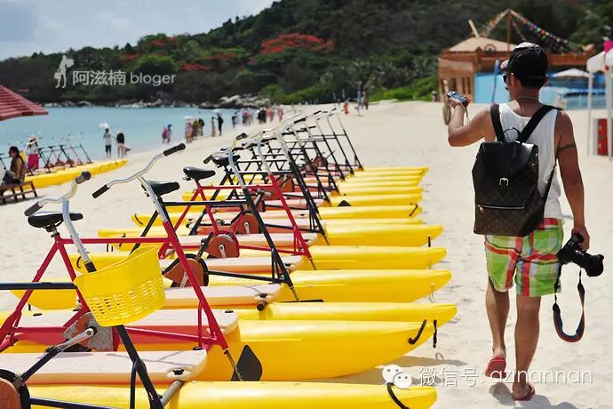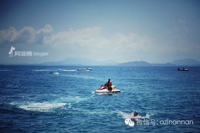 在酒店吃吃喝喝,逛花园吹海风外,难免要出去走走,有名的蜈支洲岛就在海岸线的对面。坐车10多分钟就会抵达码头了。经常出去玩,会发现走在三亚的街头,能收到若干的小广告,上书各种一日游的海上娱乐项目,价格不菲。