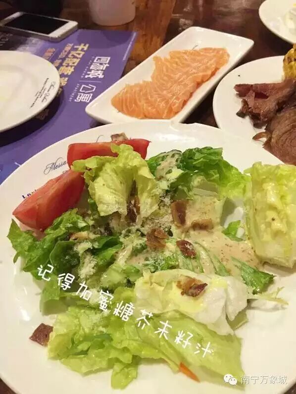 新式烤肉吃法推荐:奇葩闺蜜把烤肉当熏肉撕碎和到蔬菜沙拉中,说是要弄凯撒沙律。虽然少了一些东西,但味道非常不错。平时吃西餐的时候,这碟作为前菜的沙拉一般都贵而少,现在吃多少都可以,简直不能再棒!(蜜糖芥末籽汁超好吃,一定要试!)沙律多拿点都不怕,不会肥,还能提升战斗力!