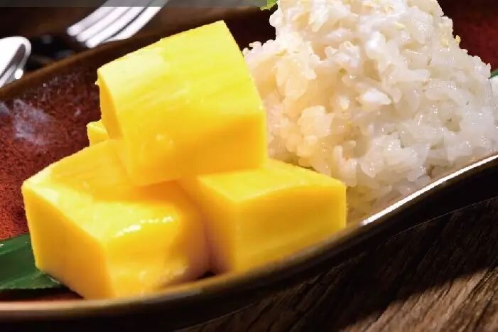 而餐厅颜值最高的一道甜品,最受爱拍照的萌妹子们喜爱的甜糯米团配泰国香芒也是我们的超推荐餐点。晶莹的糯米浇上椰奶蒸熟,金黄色的泰国芒果香甜柔滑,味甜微酸,配上糯米团子的糯米香和椰奶香,两种味道在嘴里转换融合,对于这到菜色小悦只能用“惊喜”就两个字形容。