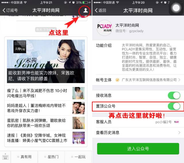 微信推出公众号置顶功能,只要按下方图示操作,就会发现PCLADY永远排在第一的位置啦❤当然你的微信得是最新版本,不然小编也帮不了你