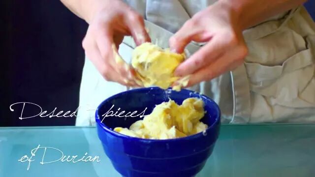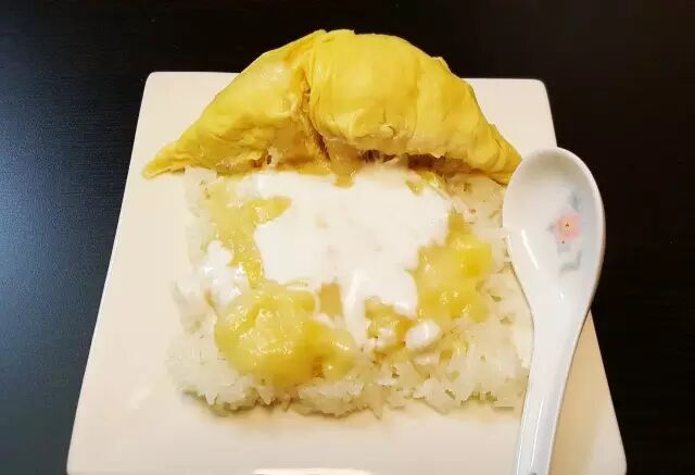 泰国最出名的水果就是榴莲了。熟透了的榴莲肉,捣碎铺在软糯的米饭上,淋上椰汁。