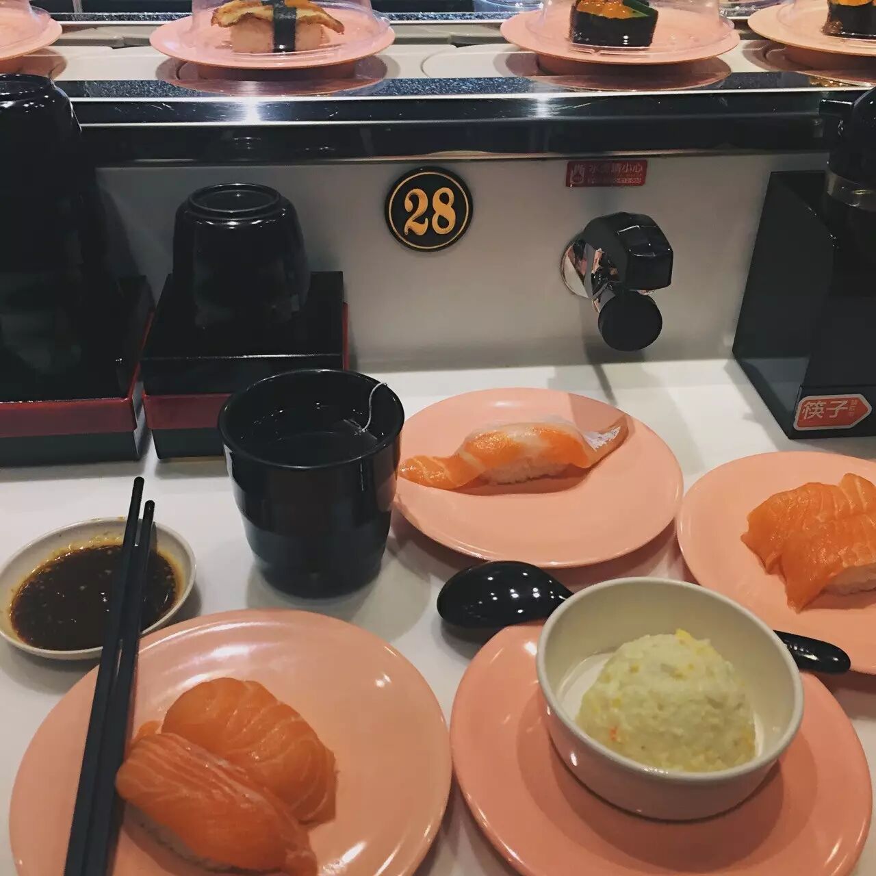 坐在回转寿司最角落的位置,不需要讲话点餐,只要等待心仪的食物慢慢转到自己面前再果断的将其大快朵颐就好了,一边嚼着鲔鱼肚腩一边捧着茶杯小口小口喝热茶的快感可能会使人一下子脱离地心引力也说不定。