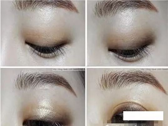 步骤7:使用带有珠光的金棕色的眼影涂抹在眼部中间,然后用眼影刷向两边晕开。