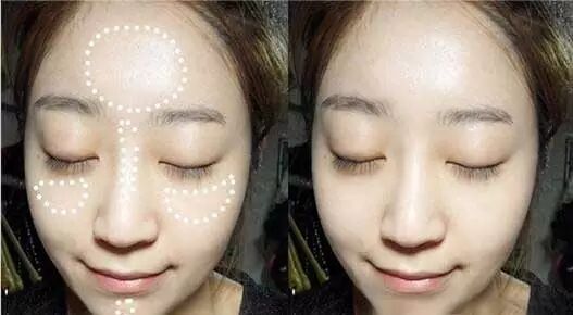 步骤2:然后使用遮瑕产品进行遮瑕,长痘和长斑的部位,要加强遮瑕效果,然后使用高光粉在额头、鼻梁、颧骨处、下巴位置打上高光,提亮肤色。