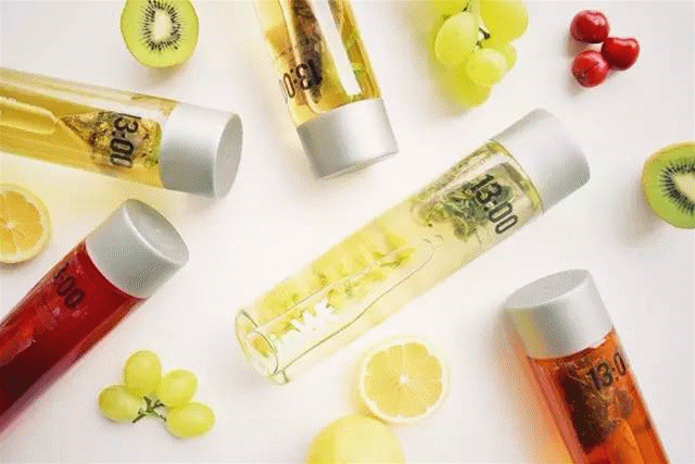 各种颜色的水果汁分装在透明的瓶子,五颜六色本身就很美。
