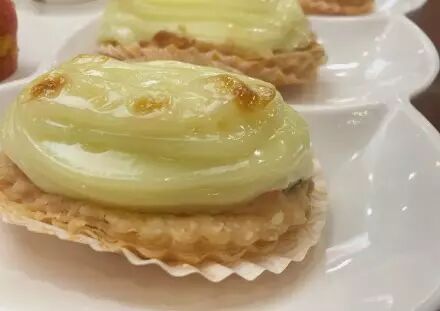 表层是厚厚的沙拉酱,烤至微蕉,中间架一片三文鱼,底下是切成丁的胡萝卜和黄瓜,伴着混了芥末的沙拉酱,最底下是葡挞的千层皮。