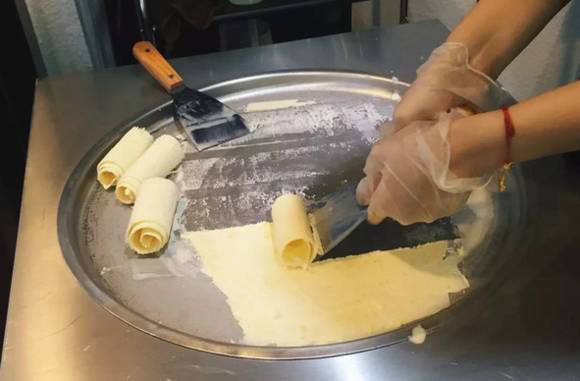 冰淇淋卷做法就厉害了!将冰淇淋液倒在冰淇淋机上,通过不断翻转炒开,在低温下冰淇淋会渐渐成型,和食材充分结合。