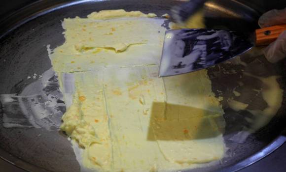 静待一会,彻底冻结成型,再将其铲起成卷状。【一颗咸蛋黄炒冰淇淋卷】其实用了两颗咸蛋王。温馨提示:咸蛋黄虽提前蒸熟,所以每天供应数量有限。