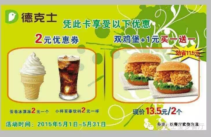 套餐内容:超级鸡腿堡1个+双鸡堡1个+黄金Q虾棒2个+德克士鸡块6块+中可2杯=60元